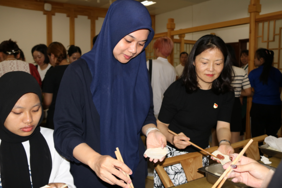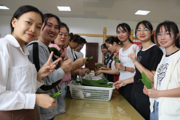 活动开始,由机关第九党支部书记蒋熠对参与本次活动的人员进行了介绍,并且为国际学生们介绍了端午节的来历,以及遵义当地的端午节风俗。随后,全体国际学生在党员教师们的带领下一起动手,学习包粽子和抄手,大家互相交流亲手制作中华传统美食的愉快体验,你一言我一语,现场洋溢着共庆端午传统佳节的欢乐气氛。