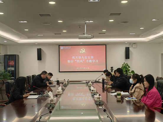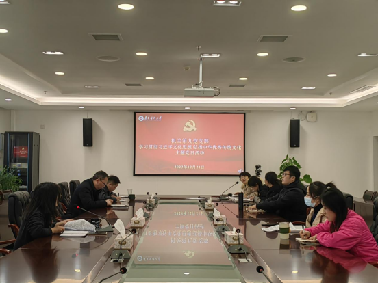 12月21日,机关第九党支部在行政楼四楼会议室开展“学习贯彻习近平文化思想,弘扬中华优秀传统文化”主题党日活动,支部全体党员参加,部门非党员人士及国际学生列席,活动由机关第九党支部书记蒋熠主持。