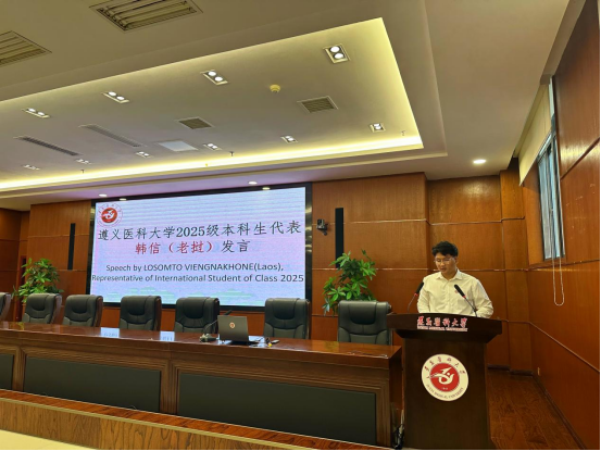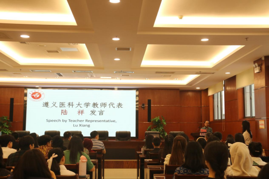 基础医学院教工第九党支部书记陆祥作为教师代表发言,他以“寄语新生”为主题,鼓励同学们尽快适应新环境,学好中文和专业课程,积极融入校园生活,在遵医书写精彩人生。