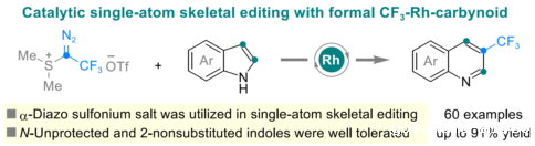 基于前期对三氟甲基卡拜及其阳离子等价体的研究(Org. Lett. 2021,23, 9256;Angew. Chem. Int. Ed. 2024,63, e202318887;Sci. China Chem. 2025,doi: 10.1007/s11426-025-2728-6),最近该团队利用自主研发的α-重氮三氟乙基锍盐作为阳离子卡拜前体,成功实现了吲哚骨架的单原子编辑,通过[2+1]环加成/分子内重排串联反应高效构建了3-三氟甲基喹啉类化合物。利用发展的合成技术,可以快速完成萘普生、伊索克酸、吲哚美辛、维生素E、布洛芬和雌酚酮等药物分子,以及Raputimonoindole B和Verticillatine B天然产物的后期骨架编辑,并可以快速完成阿达帕林类似物的制备。