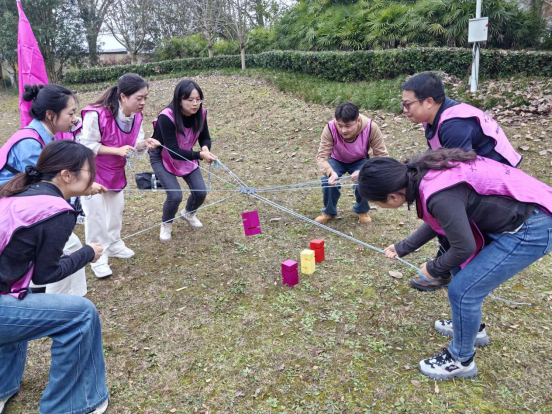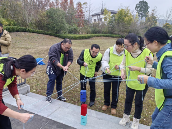 活动第一阶段为集中学习,学院党委书记张在金领学了党的二十届四中全会公报的主要内容,学院党委副书记、工会主席王红卫带领全体会员深入学习《习近平总书记关于工人阶级和工会工作的重要论述》的部分内容。第二阶段为团队拓展环节。在“友谊第一、比赛第二”的融洽氛围中,现场组建的四支队伍逐一亮相,分别展示团队名称及口号,并在拓展教练的组织下进行了破冰游戏。随后,在活动教练和裁判员的统一指挥下,依次开展了“疯狂赛道”“蒙眼互打”“合力筑塔”等多项富有协作性、趣味性的拓展项目。队员们全情投入、各展所长,既有默契配合,也有智慧碰撞,在团结协作中力争上游。现场助威声、欢呼声、笑语声此起彼伏,始终洋溢着热烈而欢乐的活跃气氛。