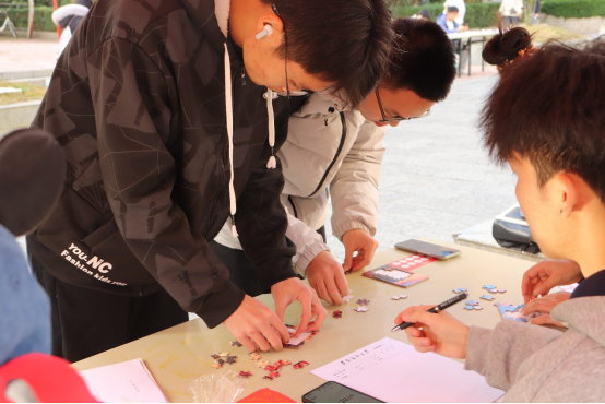 本次活动以“闯关集章”为核心形式,打造多元趣味环节,兼顾知识性与体验感,全方位激发师生参与热情。活动前期征集“致敬一二·九”主题手抄报,优秀作品于现场展示投票;活动现场玩法丰富多元,既有初心问答、历史人物猜猜乐、红色拼图挑战等知识类闯关,也有家国拼字创意解锁、运动地点投壶等特色环节,融合创意与传统游戏,更设置了爱国主题拓印、刮画手工体验,让大家在动手实践中传递赤子之心,感受红色文化魅力。参与者凭累计印章可兑换丰厚奖品,涵盖红色主题挂件、精美手账本、清新绿植、趣味盲盒等,兼具实用价值与纪念意义。