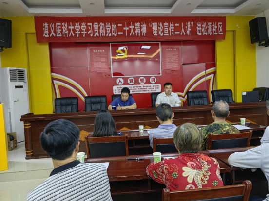 在遵义市唯一跨县易地扶贫搬迁安置点—新蒲新区新中街道办松源社区,学校党校常务副校长、党委组织部副部长柏正华与松源社区党支部书记敖廷强一同为社区群众开展了一场别开生面的理论宣讲。柏正华紧扣党的二十大报告,结合自身驻村工作经历,重点对新时代十年的伟大变革、巩固脱贫攻坚成果与乡村振兴有效衔接相关部署、提升搬迁社区后续产业可持续发展能力、加快搬迁人口市民化进程等方面进行了宣讲,并就高校“五级书记抓党建”和乡村振兴中“五级书记”抓乡村振兴工作要求、党建工作在不同组织形态中的引领作用进行了讲解。敖廷强围绕乡村振兴相关政策、松源社区集体产业情况、社区近几年取得的成绩,以及未来的发展规划向社区群众进行了分享。在宣讲过程中,两位宣讲人配合默契,将“书面语”变为群众喜欢的“家常话”,把政策解读与群众生产生活变化结合在一起,以小切口宣讲大道理,透过小故事,将党的二十大精神带到群众身边,让党的理论“活”起来。柏正华还向社区群众介绍了我校近十年在助力脱贫攻坚、服务地方经济社会发展方面的重要举措以及取得的成绩。“这种宣讲形式太好了,既有高度,又接地气,我们听得懂,也喜欢听”,社区群众这样感慨道。