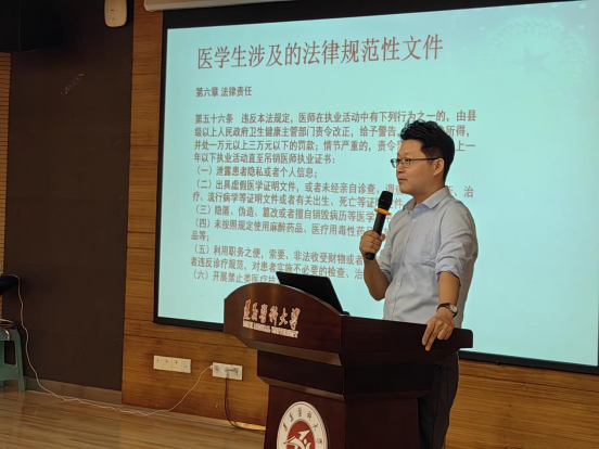 曾小虎从法律规范与职业道德的角度出发,讲解了职业道德不仅是一种行业规范,更是一种法律规范。他对医学生法律思维与职业道德及医学生涉及的法律规范性文件进行剖析,并通过实际案例分析与讨论,让医学生们了解到如何在医疗工作中遵守职业道德和法律规定、如何在实际工作中处理职业道德和法律规定的冲突。他以生动的讲述、丰富的法律知识和实践经验赢得了学生们的认可。