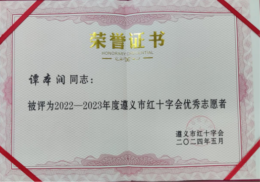 为纪念第77 个世界红十字日,大力弘扬“人道、博爱、奉献”的红十字精神,5月8日,遵义市红十字会在遵义医药高等专科学校开展2024年“5·8世界红十字日”暨中国红十字会成立120周年主题宣传活动;同时,对表现突出的集体和个人进行表彰。我校红十字会荣获遵义市“2022—2023年度优秀红十字志愿服务组织”称号,我校红十字会成员、2021级护理专业谭本润同学荣获“遵义市红十字会优秀志愿者”称号。