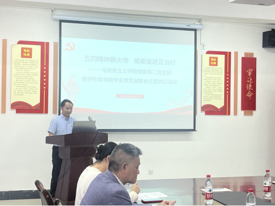 为深入学习贯彻习近平总书记有关五四运动的重要讲话精神,激励青年学子担当作为,5月17日,马克思主义学院党委第二党支部与医学影像学院学生党支部联合在心远社区开展了“五四精神薪火传,砥砺奋进正当时”的主题党(团)日活动。医学影像学院党委书记汪敏文、马克思主义学院党委副书记鲍中义应邀参加并讲话,两个支部全体党员和入党积极分子近40人参加活动。