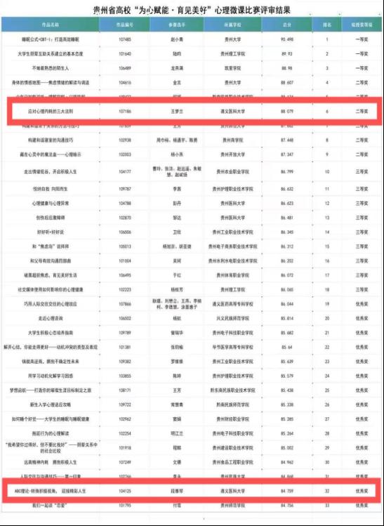 近日,由贵州省教育厅主办的“为心赋能·育见美好”贵州省高校心理微课比赛公布评审结果。我校荣获二等奖和优秀奖各1项。