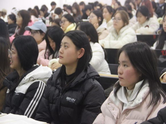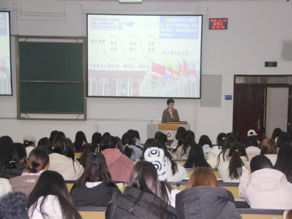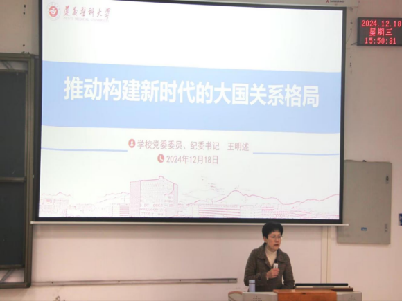 王明述围绕“百年变局下国际格局深刻调整”“动荡的世界呼唤大国协调合作”“责任与担当大国尤其要作表率”“中国的实践构建大国关系格局”四个方面系统阐述了当今世界大国关系,强调了拥有稳定的国际秩序和构建良好的国际格局的重要性。她指出,作为新时代的遵医学子,应坚定信念、潜心求学、练就本领、崇德向善、遵纪守法,主动担负起民族复兴大任。